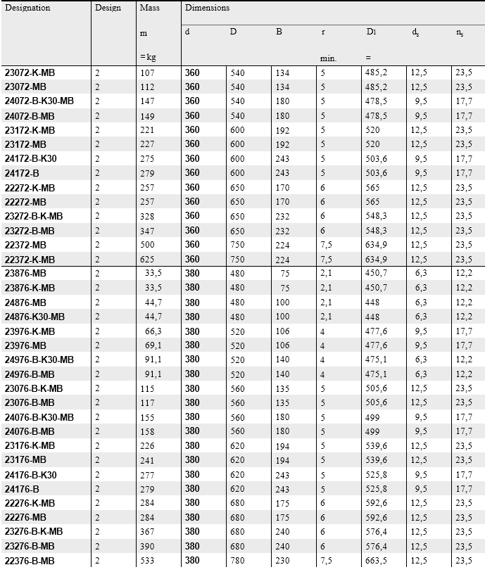 The inner rings have cylindrical or tapered bores. The symmetrical barrel rollers orient themselves freely on the concave outer ring raceway. As a result, shaft flexing and misalignment of the bearing seats are compensated, see section Compensation of angular misalignments.