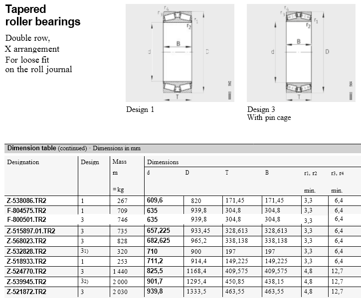 FAG  double row tapered roller bearings of various designs are special  bearings with the designation Z-5..TR2 or F-8..TR2. They comprise solid bearing rings and tapered roller and cage assemblies. The bearings are suitable for axial loads in both directions and high radial loads. Most of the bearings are separable and give a loose fit on the journal. The complete bearing is then mounted in the chock, after which the chock together with the bearing is slid onto the journal. The exception is bearings with an extended inner ring and tapered bore. These give a tight fit on the journal.