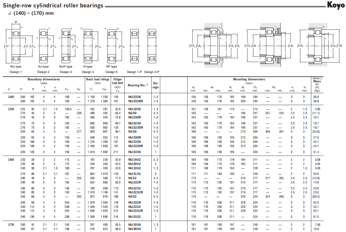 KOYO Cylindrical roller bearings feature high radial load capacity because the rollers and raceway are in linear contact. These bearings are suitable for applications