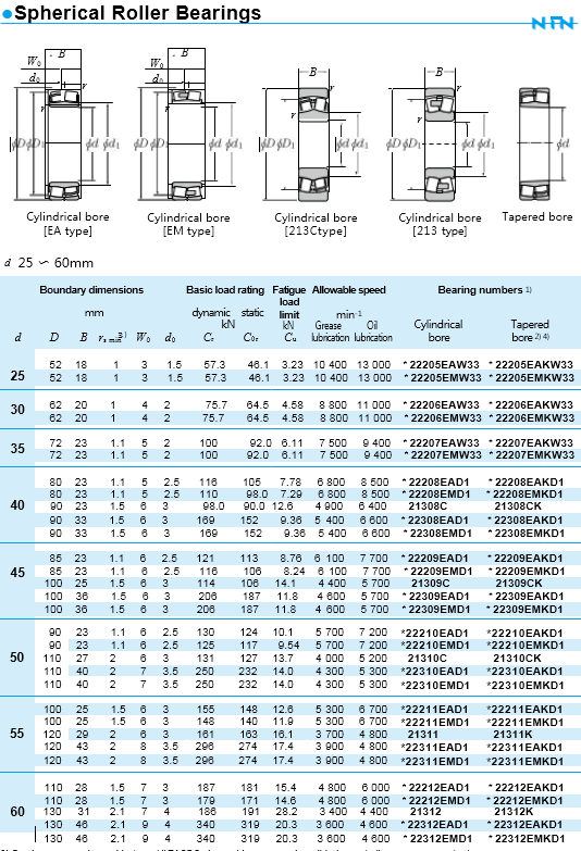 NTN Spherical roller bearings consist of an outer ring having a continuous spherical raceway and two rows of barrel-shaped rollers guided by an
