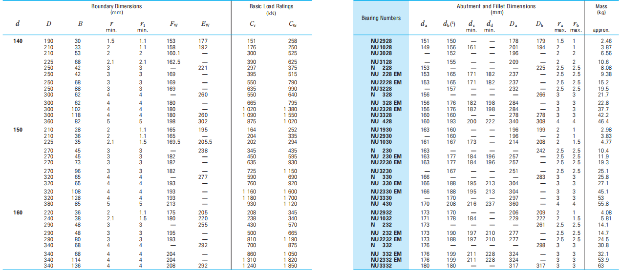 Types NU, N, NNU, and NN are suitable as free-end bearings. Types NJ and NF can sustain limited axial loads in one direction. Types NH and NUP can be used as fixed end bearings. Loose rib for NUP inner ring should be mounted so that its marked side faces outward.