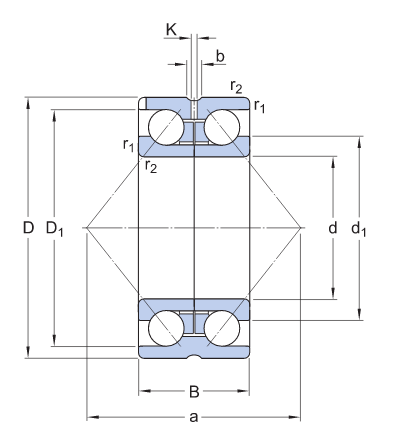 The design of SKF double row angular contact ball bearings corresponds to two single row angular contact ball bearings arranged back-to-back.