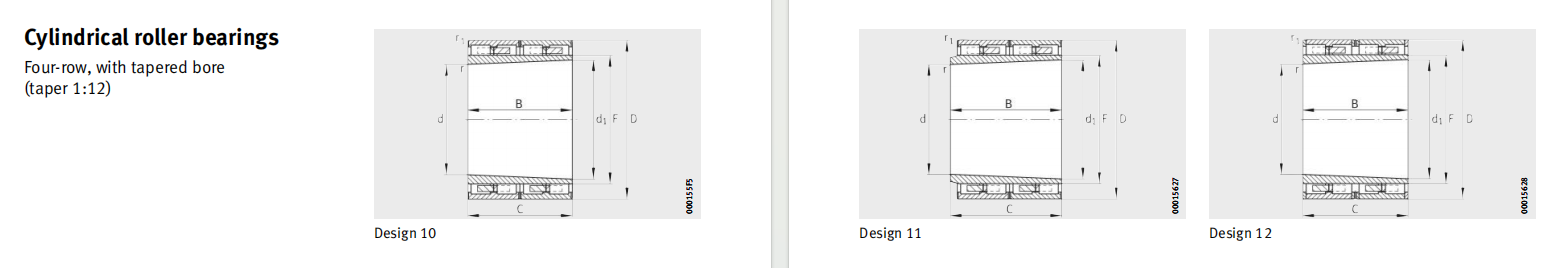 FAG Four-row cylindrical roller bearings comprise solid bearing rings and cylindrical roller and cage assemblies with solid cages.