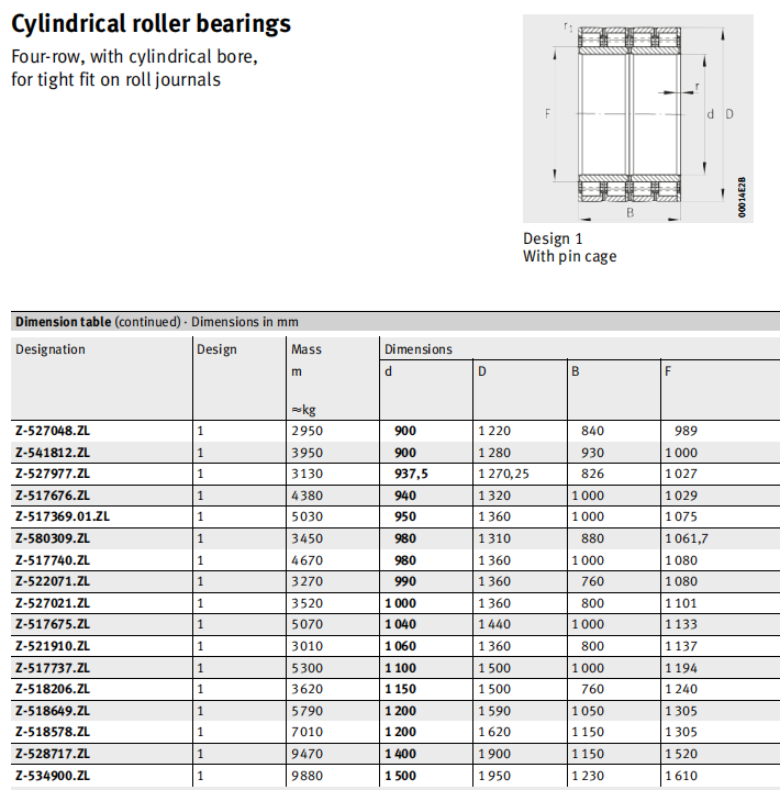 FAG Four-row cylindrical roller bearings comprise solid bearing rings and cylindrical roller and cage assemblies with solid cages.